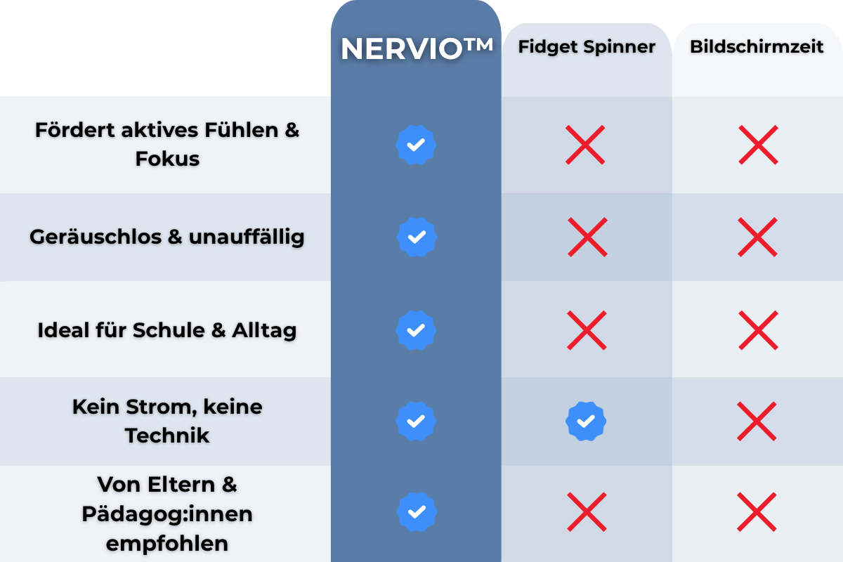 Ja – NERVIO™ ist geräuschlos, klein und diskret. Viele Kinder nutzen ihn sogar während des Unterrichts, ohne zu stören – ideal für Schule, Therapie oder unterwegs.